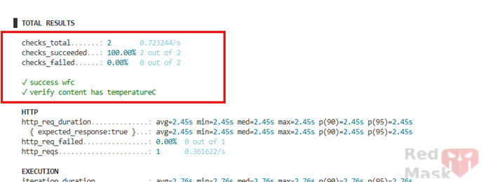 As you can see, the part inside the red box was added to the output. Here I told the system to do 2 checks for me. One is to check that all outputs are 200 responses. Second, all outputs (which are json) must contain the word 'temperatureC'.