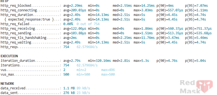 running (12.3s), 000/500 VUs, 747 complete and 0 interrupted iterations default ✓ [======================================] 000/500 VUs 7s |